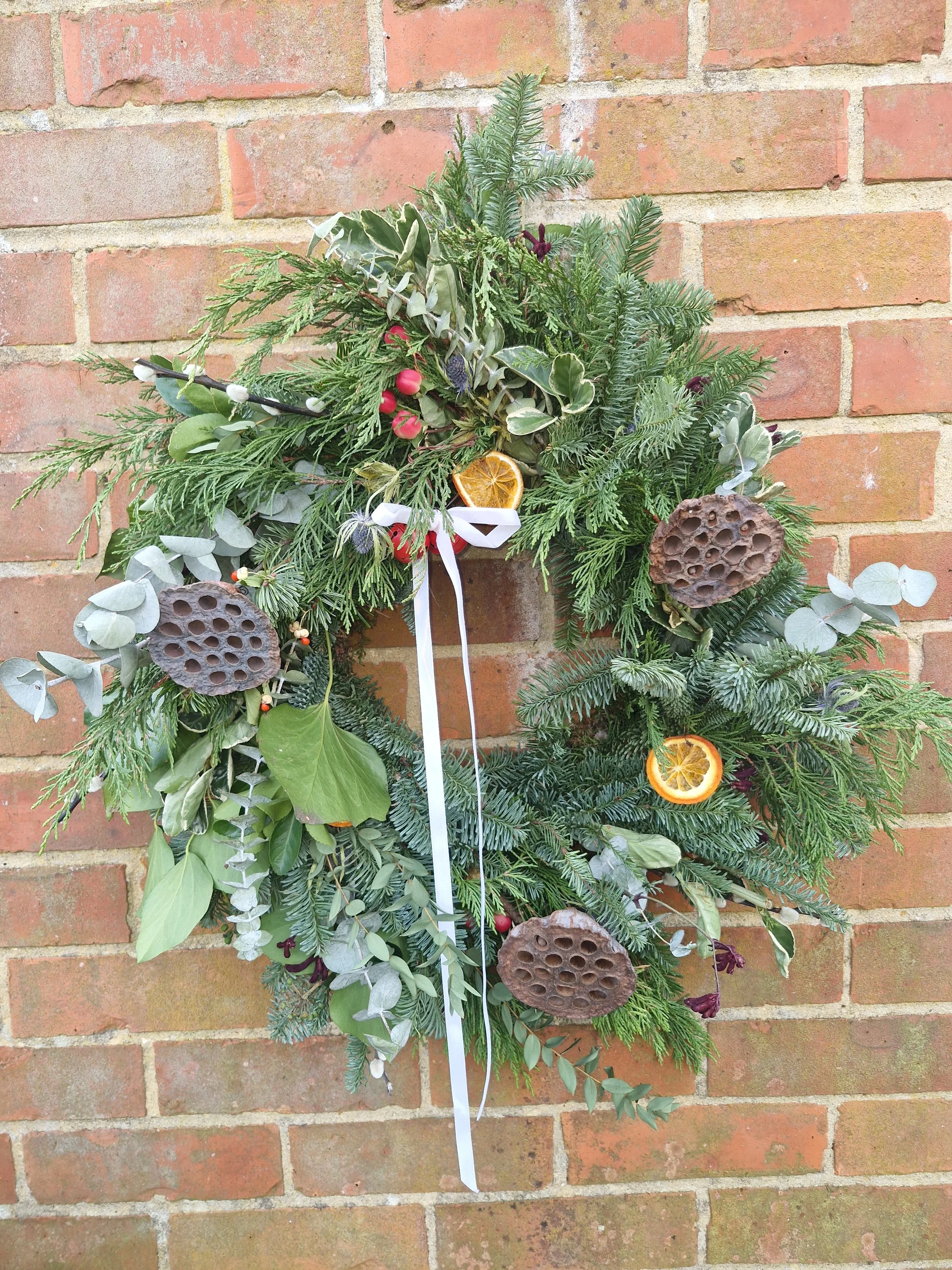 A beautiful handmade Christmas wreath, thoughtfully created using a generous mix of fresh, seasonal foliage sourced in Bournemouth, Dorset. Featuring fragrant evergreens, eucalyptus, natural lotus heads, dried citrus slices and subtle festive accents, this wreath has a relaxed, woodland-inspired feel. Finished with a soft white ribbon, it adds natural Christmas charm to your front door or interior space. Perfect for gifting or decorating your own home, with Christmas wreath delivery available across the BH postcode area.